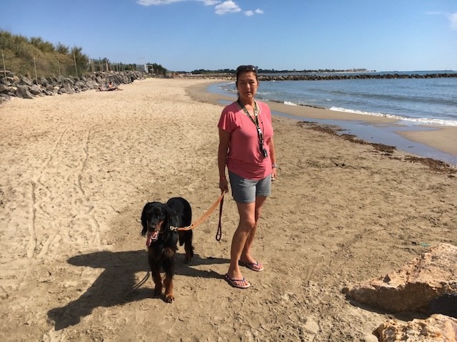 Di, 20.09.16 St.-Marie - 5. Tag - Heute Morgen herrlichstes Wetter, Nala und ich starten zum Morgengang. Uns begegnet ein älteres Paar mit Irish Setter und Dackel. Folgender Dialog entwickelt sich:"It is a Gorden?" "Yes, it is a Gordon Setter!" "No, it is a Gordon Retriever". "I know my dog, this is a Gordon SETTER". Jedenfalls waren die Holländer der Meinung, dass wir einen Retriever haben. Später auf dem CP treffen wir den Herrn wieder, der:" Ich habe im Internet nachgeschaut, es ist wirklich ein Setter, Scottish" - puh, da haben wir ja Glück gehabt, wir haben einen SETTER! Nachmittags schnorcheln wir noch einmal durch den Ort und entdecken zum 1. Mal die Stierarena, die uns vor ein paar Jahren gar nicht aufgefallen war. In der Kirche zünde ich wieder Kerzen an.